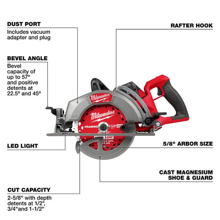 Designed for the professional carpenter, remodeler, and general contractor, the M18 FUEL™ 7-1/4" Rear Handle Circular Saw from MILWAUKEE® delivers class-leading performance. Utilizing the latest in cordless technology, this saw provides users with the power to complete more demanding applications and the cut speed to achieve greater productivity. The POWERSTATE™ Brushless Motor provides this worm drive style saw with 6,000 RPM, maintaining high speed under load, providing users the ability to complete their most demanding applications efficiently. Breakthrough advances in REDLINK PLUS™ Intelligence ensure maximum tool performance and protection from overload, overheating, and over-discharge. Paired with the M18 REDLITHIUM™ FORGE™ HD12.0 Battery, this saw provides up to 700 cuts per charge while maintaining full compatibility with all M18 REDLITHIUM™ batteries. This saw also comes with a 7-¼" 24T Thick Kerf Framing Circular Saw Blade, offering the straightest cuts and longer life. The lightweight and compact design, paired with premium ergonomics, makes this saw perfect for all-day use on the job site. For added productivity, this saw contains positive bevel detents and depth detents. A multi-sized rafter hook allows you to store the saw on different materials. Additionally, the saw has an electric blade break, rotational dust port, LED work light, and all magnesium guards and shoe, keeping you productive and providing durability to handle the toughest job site conditions.
