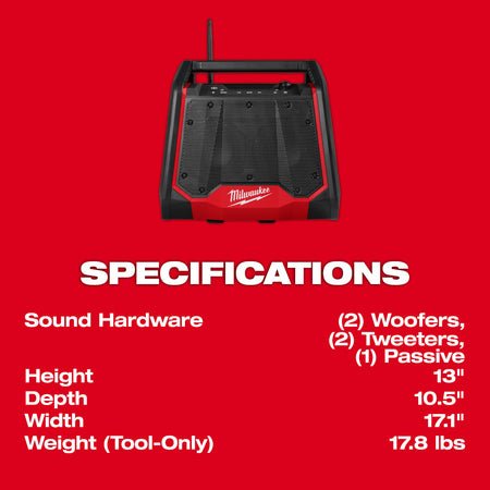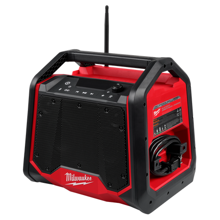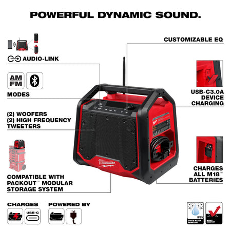 The MILWAUKEE M18 Bluetooth Jobsite Radio + Charger delivers POWERFUL, DYNAMIC SOUND. Featuring (2) 4.48” woofers and (2) 1.21" high-frequency tweeters, this radio is built to deliver optimized sound for large spaces. Bluetooth 5.3 provides up to 200 feet of range to keep you connected throughout the job site. AUDIO-LINK technology allows you to wirelessly connect and play music across multiple compatible Milwaukee devices (over 200+), creating a larger sound experience. Powered by an M18 REDLITHIUM XC5.0 Battery, this radio provides up to 8 hours of runtime at 100% volume. With built-in equalizer settings, you can customize your own preferred sound experience. This M18 Bluetooth Jobsite Radio + Charger also features built-in M18 battery charging and USB-C charging for personal devices. Engineered for the job site, this radio is fully compatible with the PACKOUT Modular Storage System and is built to handle tough conditions with impact, dust, and water resistance.