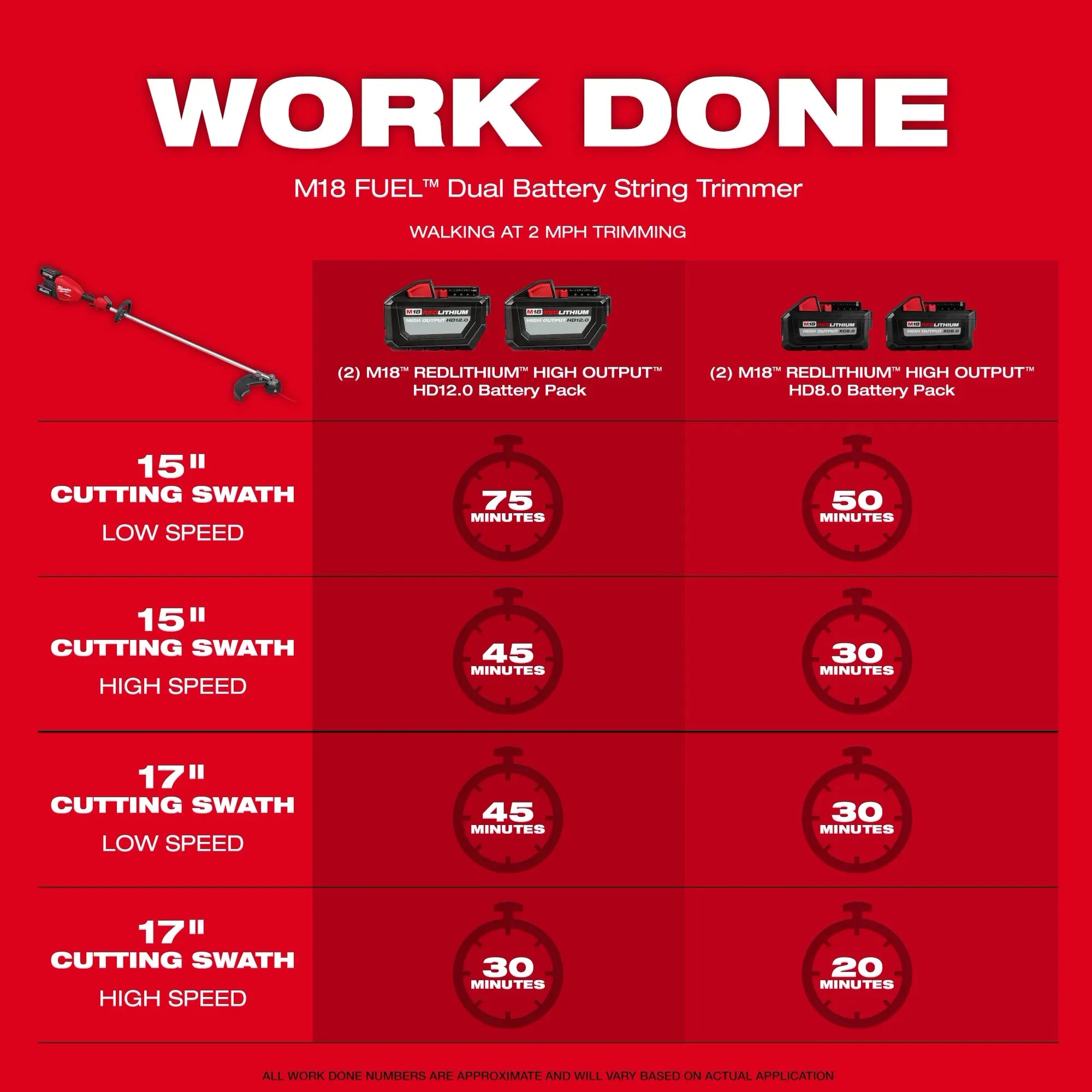 Our M18 FUEL™ 17" Dual Battery String Trimmer meets the performance, durability, and ergonomic needs of landscape maintenance professionals. Our string trimmer provides the Highest Power, delivering the most peak torque compared to leading professional gas and battery string trimmers. This string trimmer provides users with the Fastest Clearing, cutting through the most demanding applications while maintaining the highest string speed. The POWERSTATE™ Brushless Motor and advanced electronic package allow the string trimmer to reach Full Throttle in Under 1 Second, boosting control and productivity. The REDLINK PLUS™ Intelligence enables full-circle communication between the tool and battery, providing you with unmatched levels of performance, protection, and productivity. The advanced electronic package also delivers high and low speeds, and a variable speed trigger giving you ultimate control over the power range. The string trimmer requires (2) M18™ REDLITHIUM™ Batteries for operation and is optimized to be used with M18™ REDLITHIUM™ HIGH OUTPUT™ batteries. The M18™ REDLITHIUM™ HIGH OUTPUT™ XC8.0 Battery gives you best-in-class performance and run-time in all applications. The Easy Load Trimmer Head provides an easy line loading experience and the ability to load up to 25' of trimmer line in under 30 seconds. The M18 FUEL™ 17" Dual Battery String Trimmer is fully compatible with 250+ solutions on the M18™ system.
