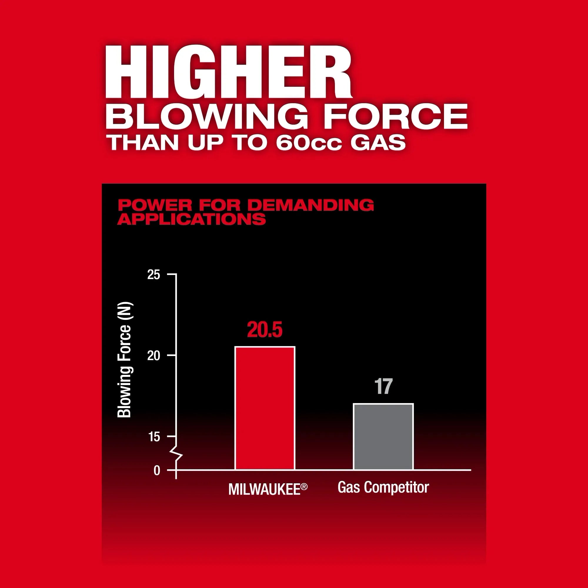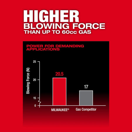 The M18 FUEL™ Dual Battery Backpack Blower is designed for the professional, delivering a higher blowing force than up to 60cc gas. The backpack blower reaches full throttle of 650 CFM and 155 MPH in under one second, boosting productivity and control. The blower requires at least (2) M18™ REDLITHIUM™ Batteries for operation, while providing (2) additional batteries terminals to extend runtime. This battery set-up allows the operator to adjust the number of batteries for either lighter weight in quicker clean ups or more runtime in extended clearing applications. This adjustable battery configuration combined with a fully adjustable harness, mode select, telescoping nozzle, variable speed trigger, and low noise level of just 62dB(A) allow the blower adapt to all the operator's needs when using. The M18 FUEL™ Dual Battery Backpack Blower is part of the M18™ System, fully compatible with over 250+ solutions.