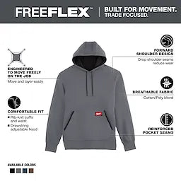 Part of the MILWAUKEE® FREEFLEX™ Collection, our Midweight Pullover Hoodie is BUILT FOR MOVEMENT. Our Midweight Pullover Hoodie is EASY TO LAYER and MORE BREATHABLE. Our midweight hoodie offers seasonal versatility while delivering on a trade focused design with drop shoulder seams and reinforced pocket seams. The comfortable fit and design allows our users to move freely and easily on the job. Choose from Black, Brown, Gray, or Blue colors, available in sizes small to 3XL.
