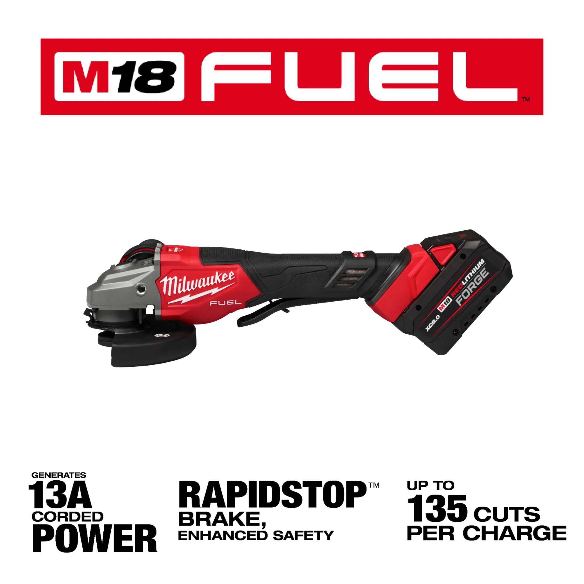 Our M18 FUEL™ 4-1/2" / 6" Braking Grinder Paddle Switch battery kit is the next advancement in power and performance, generating 13A corded power, fastest cutting, and delivering up to 135 cuts per charge. The M18 FUEL™ 4-1/2" / 6" Braking Grinder Paddle Switch battery kit generates 13A corded power allowing you to complete the toughest grinding and cutting applications, all on the M18™ Cordless System. The POWERSTATE™ Brushless Motor delivers maximum sustained power and 9,000 RPM to remove material faster and increase productivity. REDLINK PLUS™ Intelligence ensures unmatched levels of performance, protection, and compatibility. The RAPIDSTOP™ Brake provides stop times under 2 seconds with an abrasive disc. The M18 FUEL™ 4-1/2" / 6" Braking Grinder Paddle Switch battery kit includes an electronic clutch for kickback protection, as well as overload protection to maximize motor life. The M18™ REDLITHIUM™ FORGE™ XC8.0 Battery Pack for HIGH OUTPUT™ HD12.0 power in a smaller size, and longest life vs. REDLITHIUM™ batteries. The MILWAUKEE® M18 FUEL™ 4-1/2" / 6" Braking Grinder Paddle Switch battery kit includes two M18™ REDLITHIUM™ FORGE™ XC8.0 Battery Packs and one M18™ & M12™ Rapid Charger.