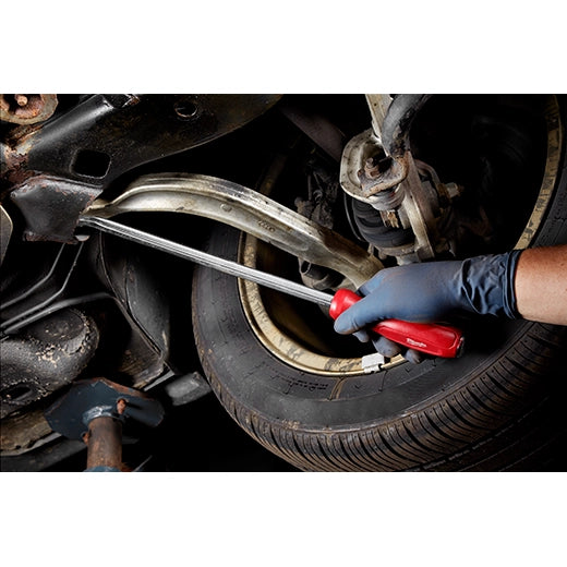 Our 12" Pry Bar features an I-Beam design for up to 40% more prying strength. The pry bar's all-metal core improves durability, allowing our users to get the job done every time. A built-in hammer-ready strike cap improves your leverage when working in tight and tricky spaces. Our metal pry bar has a comfortable tri-lobe handle and features a durable chrome finish for superior corrosion resistance and easy cleaning. Our pry bars are backed by a MILWAUKEE® Lifetime Guarantee.