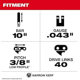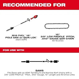 The MILWAUKEE® 10" Pole Saw Guide Bar is to be used with the Milwaukee M18 FUEL™ 10" Pole Saw w/ QUIK-LOK™ (2825-20PS), M18 FUEL™ QUIK-LOK™ 10" Pole Saw Attachment (49-16-2720) and 10" Pole Saw Chain (49-16-2723). The bar length is 10", the pitch is 3/8" Low Profile, and the gauge is .043". The Narrow Kerf Design delivers maximum efficiency for longer run-time. The saw chain guide bar has a durable design and is weather-resistant for increased life.