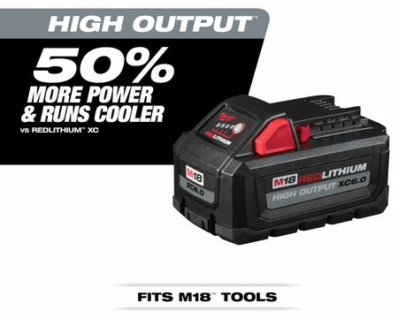 The M18™ REDLITHIUM™ HIGH OUTPUT™ XC6.0 Battery Pack provides 50% more power and runs 50% cooler vs M18™ REDLITHIUM™ XC battery packs. The optimized combination of size and increased power provides a great solution for the entire range of M18™ products. It delivers fade free power and runs substantially cooler through heavy applications, allowing tradesmen to push their cordless tools harder and longer than ever before. The M18™ REDLITHIUM™ HIGH OUTPUT™ XC6.0 provides increased power in extreme cold weather conditions (below 0F / -18C) and delivers more work per charge, driving corded replacement on the jobsite. The REDLITHIUM™ HIGH OUTPUT™ XC6.0 battery is fully compatible with 150+ M18™ solutions.