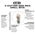 - Milwaukee® SDS-Max drill bits provide faster drilling speeds, increased life, and more cordless efficiency. Breaker point pulverize the material leading to up to 20% faster drilling speeds. Rebar guards protect the bit when hitting hard aggregate and rebar leading to longer life. Variable flutes remove the dust out of the hole more efficiently resulting in up to 15% more holes per battery charge. Wide flute entrances lead to faster drilling speeds, while reinforced flutes prevent bit breakage, rendering increased durability in tough concrete applications. The centering tip allows for exact spot drilling. All SDS-Max drill bits meet the ANSI specification for drilling holes for anchor applications and include wear mark indicator when signifying when the bit no longer meets the ANSI spec.