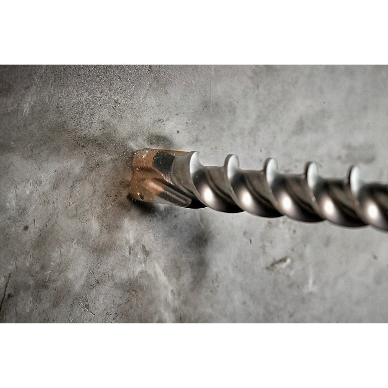 Milwaukee® SDS-Max drill bits provide faster drilling speeds, increased life, and more cordless efficiency. Breaker point pulverize the material leading to up to 20% faster drilling speeds. Rebar guards protect the bit when hitting hard aggregate and rebar leading to longer life. Variable flutes remove the dust out of the hole more efficiently resulting in up to 15% more holes per battery charge. Wide flute entrances lead to faster drilling speeds, while reinforced flutes prevent bit breakage, rendering increased durability in tough concrete applications. The centering tip allows for exact spot drilling. All SDS-Max drill bits meet the ANSI specification for drilling holes for anchor applications and include wear mark indicator when signifying when the bit no longer meets the ANSI spec.