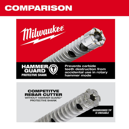 - The MILWAUKEE® SDS-Plus Rebar Cutters are the toughest in rebar, delivering up to 3x life compared to competitive rebar cutters. Designed with precision ground carbide, these drill bits shred through rebar providing up to 10x faster drilling speeds vs. 4-cutter drill bits. Milwaukee SDS Plus Rebar Cutters are equipped with HAMMER GUARD protective shanks, preventing carbide teeth destruction from accidental use in rotary hammer mode, saving time and money. Deep debris channels provide the fastest rebar shard removal while double ejection slots allow for easy rebar slug removal. Available in sizes 3/8 1-1/2, Milwaukee SDS Plus Rebar Cutters are the optimal solution for drilling embedded rebar for corded and cordless SDS-Plus rotary hammers.