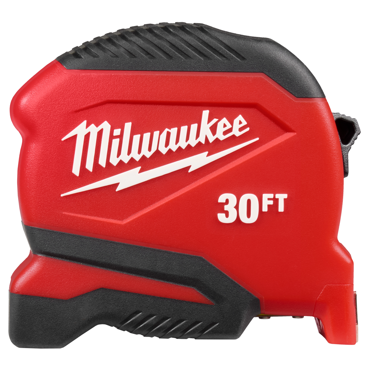 Milwaukee's 30ft Compact Tape Measure delivers a stiff blade and fractional scale, allowing for quick measurements. With an anti-tear coating that reinforces the first 6” of the blade and an impact resistant body, this tape withstands jobsite conditions. The Compact Tape Measure’s finger stop protects from blade retraction. This tape measure features 12’ of Reach and 9’ of Standout, allowing you to take long measurements on your own.