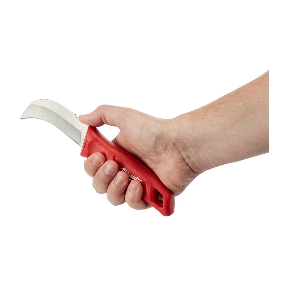 The Milwaukee® Fixed Blade Hawkbill Knife is ideal for stripping wire and cable. The stainless steel blade is optimized to stay sharper longer and a full metal tang provides durability for tough cuts. The oversized ergonomic handle is designed for comfortable use with gloves. A durable molded sheath provides easy carry and storage.