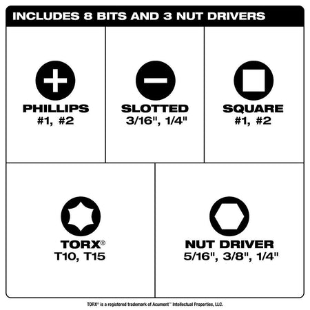 - Included Bits: PH1, PH2, SL1/4", SL3/16", SQ1, SQ2, T10, T15
