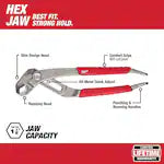 The Milwaukee 8" Hex-Jaw Pliers feature an aggressive V-Jaw geometry for the best fit and strongest hold on hexagonal bolts. An all-metal quick adjust mechanism allows for precise fits on hex bolts. Milwaukee Hex-Jaw pliers incorporate Milwaukee REAM & PUNCH exposed metal handles (patent pending) and a precision ground pliers head for reaming pipe and punching electrical knock outs. Milwaukee pliers feature slim profile over-molded comfort grips, which will not peel under jobsite conditions. All Milwaukee pliers are forged for strength and feature rust protection for long life.