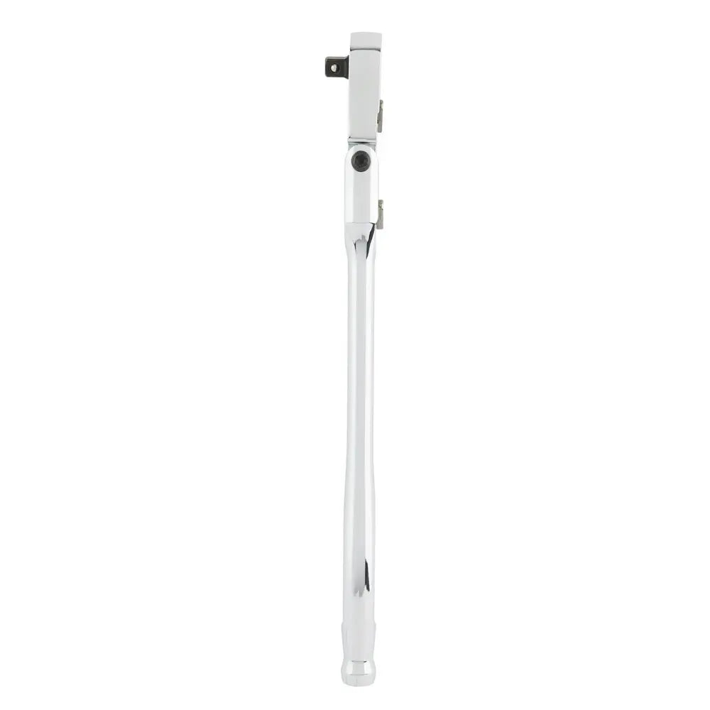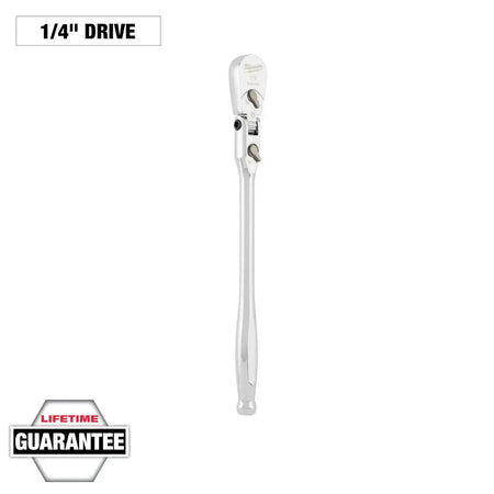 Our 1/4” Drive 9” Flex Head Ratchet with a 4⁰ arc swing provides you with better access and is more adaptable to working in spaces with different angles. The ratchet head can be locked into 7 unique positions or left unlocked for free movement during use. The extended handle length offers you increased leverage for stubborn nuts and bolts while the slim profile and flush directional and locking levers offer more accessibility in tight spaces. The all-chrome finish makes cleaning the MILWAUKEE® extended handle flex head ratchet easy. We back this ratchet with our Mechanics Hand Tools Lifetime Guarantee.