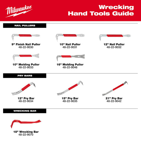 Milwaukee's 16” Molding Puller is equipped with a SMOOTHPULL high-leverage head, delivering maximum leverage for quick nail removal. The grip is the most durable in the industry, offering wear resistance for continual comfort over the life of the tool and vibration reduction when struck by a hammer. The beveled edges of the molding puller allow for better access to hard-to-reach nails, and the wide claw helps lift shingles and siding. The precision claws and integrated nail removal feature on the head of the Molding Puller allow you to remove embedded nails, reducing damage to surrounding materials. The 3 nail slots are optimized for 8D-16D nails, delivering increased efficiency on the job site. A Limited Lifetime Warranty covers the 16” Molding Puller.