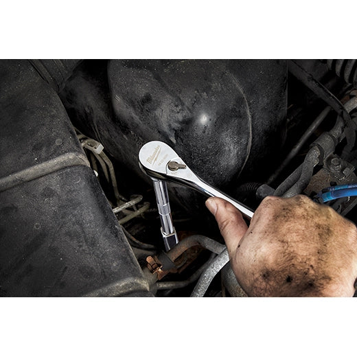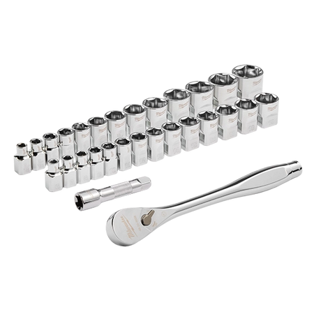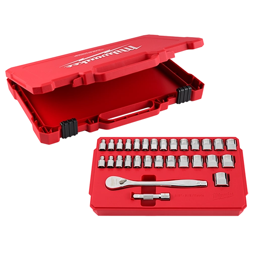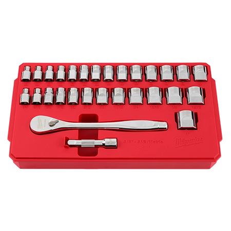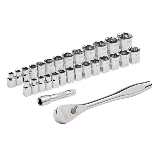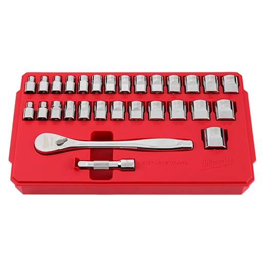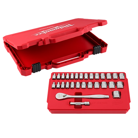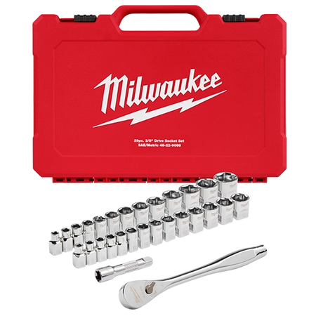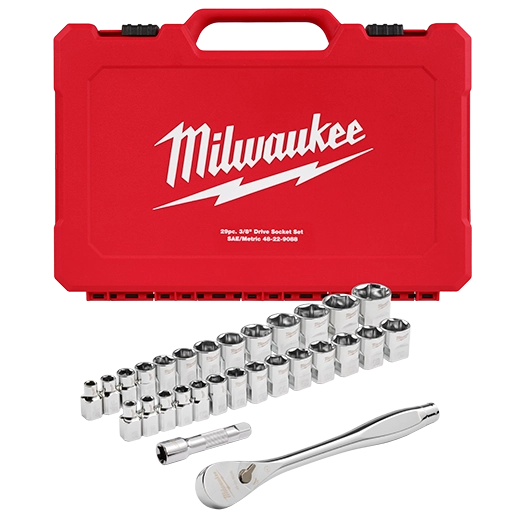 Our MILWAUKEE® 29 piece 3/8" Drive Ratchet & Socket set is designed from the ground up, offering our users the Most Versatile Sockets that are Anti-Roll and Wrench-Ready. Its innovative FOUR FLAT™ Sides feature an anti-roll and wrench-ready design. The 90 tooth ratchet tool offers 4° of arc swing and a slim profile design, allowing you to work in tighter and more confined spaces. Our 29 piece socket set comes with a removable inner tray which is perfectly designed to be stored long-term in a steel storage chest. All of our sockets are stamped with metric and SAE measurements on the flat side for easy-to-read visibility. It also comes with a durable carrying case for ultimate portability. This set includes an extension bar so that our users can get every job done, both in the garage and on the job site. Our ratchet and socket set is backed by our Lifetime Guarantee.