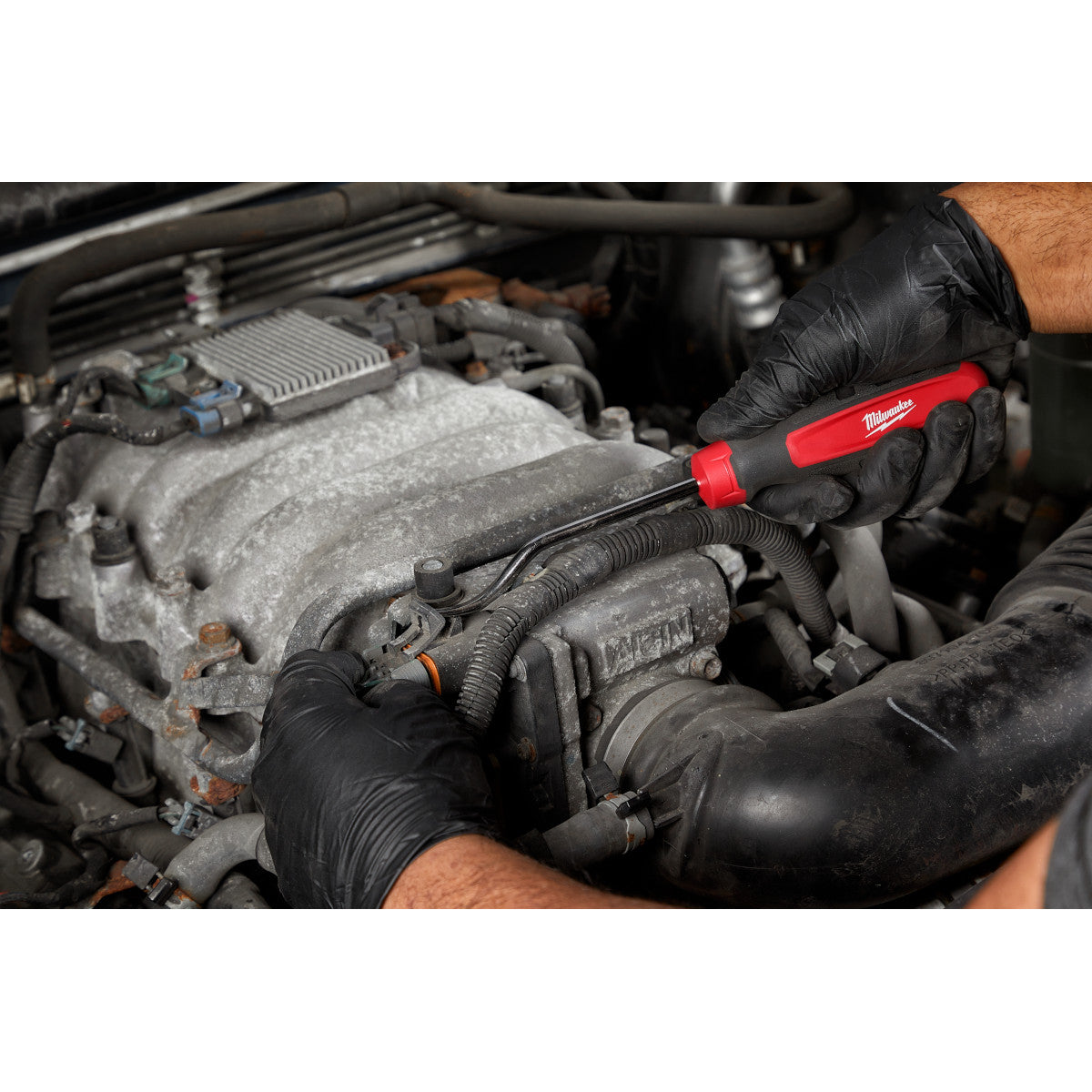 Our hose picks feature an all-metal core for up to 50% more durability. Each pick has a specific angle for different applications while the reinforced tip resists bending when loosening stubborn hoses. The flat pick provides puncture protection and reduces damage to hoses. Our Comfort grip handles give you increased tool control and comfort. This set features a hook, 90°, 45°, and flat hose pick along with a durable long-term storage tray for easy access and organization. These chrome-plated picks provide superior rust protection. All MILWAUKEE Mechanics Hand Tools are backed by a lifetime guarantee.