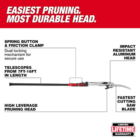 Our 16' Pole Saw & Pruner delivers the Easiest Pruning with the Most Durable Head and fastest-cutting saw blade. The high-leverage pruning head has a cut capacity of up to 1 ¼", while the Saw blade can cut branches up to 7". The impact-resistant aluminum head withstands drops on the job. This Pole Saw & Pruner can be telescoped securely up to 16' in length with the spring button and friction clamp dual locking mechanism and has a rubber end cap for comfort during use. The pole is constructed with lightweight fiberglass and aluminum and has onboard rope storage. While not in use, the saw blade can fold down and lock securely onto the head with a wingnut. The 16' Pole Saw & Pruner is covered by a limited lifetime warranty.