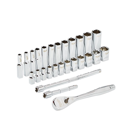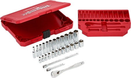 Our MILWAUKEE® SAE 28 piece 1/4" drive Ratchet & Socket set is designed from the ground up, offering our users the Most Versatile Sockets that are Anti-Roll and Wrench-Ready. Its innovative FOUR FLAT™ Sides feature an anti-roll and wrench-ready design. The 90 tooth ratchet tool offers 4° of arc swing and a slim profile design, allowing you to work in tighter and more confined spaces, be it under the hood of a car or in the middle of a remodel. The ratchet and socket kit comes with a removable inner tray which is perfectly designed to be stored long-term in a steel storage chest. All of our sockets are stamped with metric measurements on the flat side for easy-to-read visibility. It also comes with a durable carrying case for ultimate portability. The set comes with accessories included so that our users can get every job done, both in the garage and on the jobsite. Our ratchet and socket set is backed by our Lifetime Guarantee.