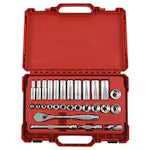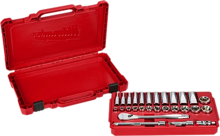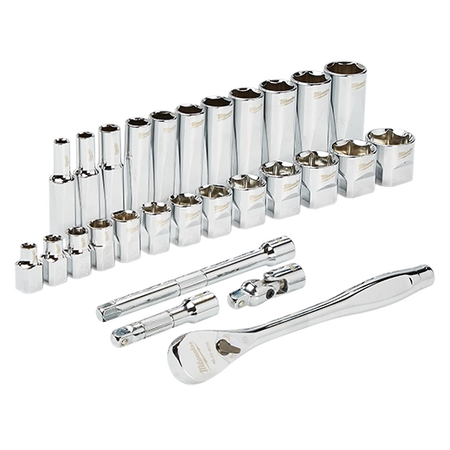 Our MILWAUKEE® SAE 28 piece 3/8" drive Ratchet & Socket set is designed from the ground up, offering our users the Most Versatile Sockets that are Anti-Roll and Wrench-Ready. Its innovative FOUR FLAT™ Sides feature an anti-roll and wrench-ready design. The 90 tooth ratchet tool offers 4° of arc swing and a slim profile design, allowing you to work in tighter and more confined spaces, be it under the hood of a car or in the middle of a remodel. The ratchet and socket kit comes with a removable inner tray which is perfectly designed to be stored long-term in a steel storage chest. All of our sockets are stamped with SAE measurements on the flat side for easy-to-read visibility. It also comes with a durable carrying case for ultimate portability. The set comes with accessories included so that our users can get every job done, both in the garage and on the jobsite. Our ratchet and socket set is backed by our Lifetime Guarantee.