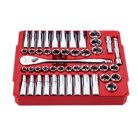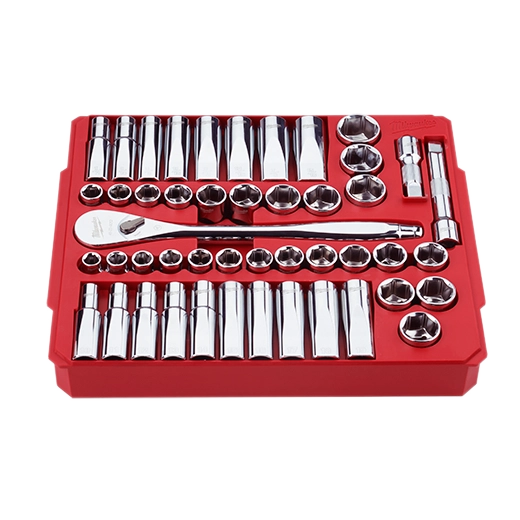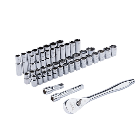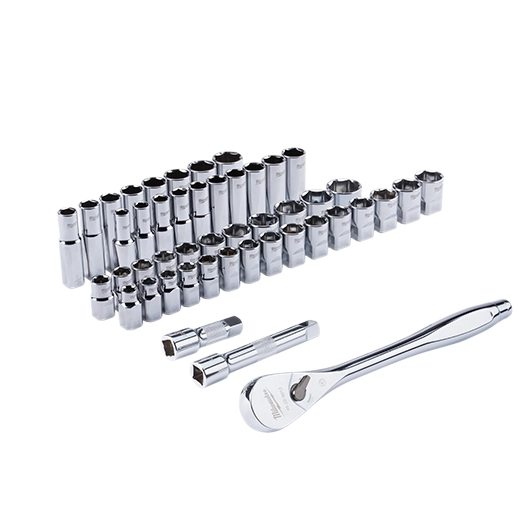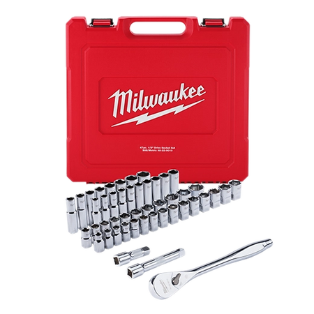 Our 47-Piece SAE & Metric 1/2" Drive Ratchet and Socket Set offers better access in tight spaces and maximum tool strength. The 90-tooth ratchet tool offers 4°of arc swing and a slim profile design, so you can work in tighter spaces. The MILWAUKEE® socket set features an innovative wrench-compatible socket design with FOUR FLAT™ sides to help prevent rolling. The ½” drive ratchet has sockets with sizes laser engraved into the flats for easy-to-read visibility. Our optimized socket geometry additionally helps reduce bolt rounding and stripping. The Milwaukee ratchet and socket set includes a removable inner designed to be stored long-term in a steel storage chest and a durable carrying case for ultimate portability. The set's accessories guarantee you have what you need to tackle every job, both in the garage and on the jobsite. The 46 Piece SAE & Metric ½” Drive Ratchet and Socket Set is backed by a lifetime guarantee.