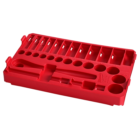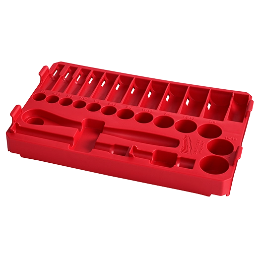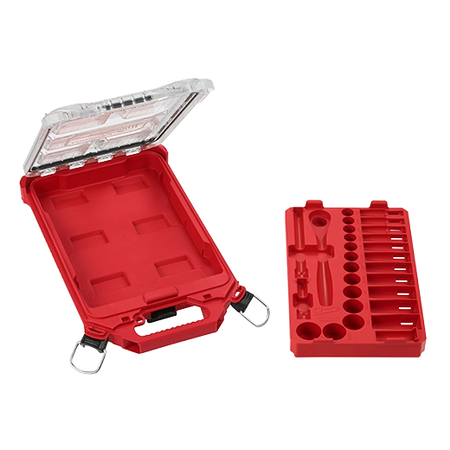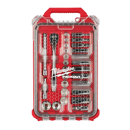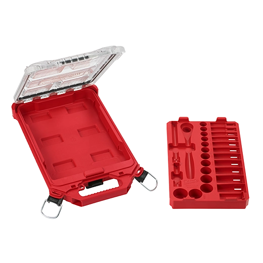 Our Ratchet and Socket Set features sockets that have FOUR FLAT™ Sides that deter rolling and are wrench compatible for maximum productivity. The 90-tooth ratchet tool that provides 4° of arc swing and a slim profile for work in tighter spaces. We’ve stamped the sizes into each socket for easy-to-read visibility. You can keep our 28-piece 3/8 in. Drive Ratchet and Socket Set organized in the included PACKOUT™ Compact Low-Profile Organizer equipped with a clear top for easy identification of parts. This PACKOUT™ Organizer is IP65 rated and built from impact-resistant materials for durability on the jobsite with a reinforced hinge and heavy-duty latches. The Compact Low-Profile Compact Organizer is part of the MILWAUKEE® PACKOUT™ Modular Storage System, allowing you to custom build storage systems to easily transport and organize your tools and accessories. This Combo Kit includes a 28 Piece 3/8 in. SAE Drive Ratchet and Socket Set and a PACKOUT™ Compact Low-Profile Organizer.