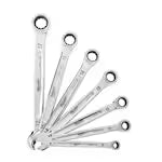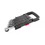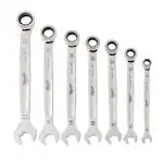 Our Ratcheting Combination Wrenches feature 2.5° of arc swing, allowing our users to work quickly and efficiently in tight spaces. Our mechanic's wrenches feature durable double-stacked pawls in the ratcheting mechanism offer the longest ratchet life and improved access with 144 ratcheting positions. MAX BITE™ Open-End Grip improves the ratchet wrench's grip on nuts and bolts, offering 25% more torque than smooth-faced wrenches. Each combination wrench features a comfortable I-Beam handle design for improved ergonomics. Our ratcheting combination wrench set features ink-filled size labels for easy size identification, as well as quick distinction between SAE and metric sets. The 7-piece metric ratcheting combination wrench set comes in a portable locking storage tray, offering organization both on and off the job site. We stand behind our products, offering a Lifetime Guarantee on all of our combination ratchet wrench sets.