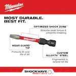 Our SHOCKWAVE™ Impact Duty™ Square Bits are engineered to be the most durable, best fitting driver bits on the market. The Wear Guard Tip™ delivers increased wear resistance which protects the fit over the life of the bit. The Shockzone™ is optimized for for each tip type and length of driver bit to absorb peak torque and prevent breaking. The Custom Alloy76™ has customized steel and heat treatment per tip type to extend the life of the driver bits, providing up to 50X life vs. competitive impact driver bits. The MILWAUKEE® SHOCKWAVE™ driver bits are built to deliver extreme durability for the most demanding applications.