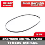 The MILWAUKEE® 35 3/8 in. 8/10 TPI Extreme Thick Metal Compact Band Saw Blade 3-Pack maximizes band saw blade performance. These blades meet the demands of daily job site use, delivering more cuts and fewer blade changes. An aggressive variable tooth design provides the versatility to cut more metals of various thicknesses without changing blades.