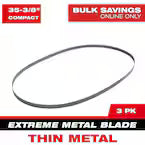 The MILWAUKEE® 35 3/8 in. 12/14 TPI Extreme Thin Metal Compact Band Saw Blade 3-Pack maximizes band saw blade performance. These blades meet the demands of daily job site use, delivering more cuts and fewer blade changes. An aggressive variable tooth design provides the versatility to cut more metals of various thicknesses without changing blades.