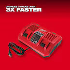 The M18™ Dual Bay Simultaneous Rapid Charger is capable of charging 2 battery packs simultaneously, over 3X faster than standard sequential chargers. The charger accepts all M18™ batteries. Equipped with REDLINK™ Intelligence, this charger communicates directly with M18™ batteries to monitor cell voltage, temperature and charge status to deliver the best combination of charge duration and pack lifespan. Simultaneously charging batteries at a rapid charge rate massively reduces downtime and maximizes productivity. Its compact size makes this an ideal charger to carry on and off the job, hang in a work trailer, or charge on the top shelf of a job box.