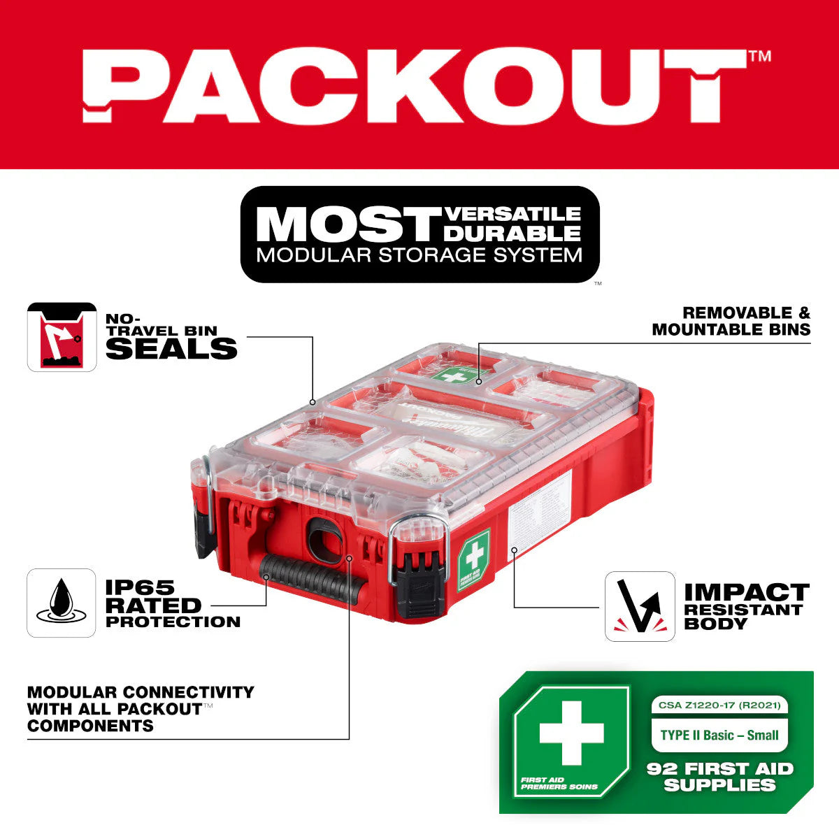 The MILWAUKEE® PACKOUT™ Type II Basic Small First Aid Kit is part of the most versatile, durable, modular storage system. The Milwaukee first aid kit's impact-resistant body keeps contents safe from drops and bumps on the jobsite. An IP65 rated weather seal protects bandages, adhesives, antibiotics, and other essential medical supplies from rain and other jobsite debris. This jobsite first aid kit's no-travel bin seals keep all contents secure and in their proper place. The MILWAUKEE® PACKOUT™ Organizer comes with 92 essential first aid items meeting CSA Z1220-2017 (R2021) Type II Basic Small standard, tailored to the most common injuries you encounter on the jobsite. The transparent lid of the organizer seals the contents from migrating and shifting during transport. Heavy duty latches and reinforced hinges ensure that the organizer keeps the contents contained and protected.