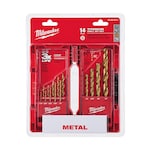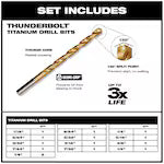 The 14-Piece Milwaukee Thunderbolt® Titanium coated Drill Bit Set offers convenience and heavy-duty performance on the jobsite. Milwaukee Thunderbolt Titanium coated drill bits are designed for extreme durability and up to 3X longer life. The Thunderbolt web features a thicker core than a standard drill bit to provide ultimate strength and protect against side-load breakage. The titanium coating reduces heat build-up and keeps the bit sharp to extend performance. A specially designed parabolic flute form clears chips and debris fast to keep the bit cool. The 135° split point tip delivers a precision start and prevents walking for fast, accurate holes. Effective for drilling on curved surfaces, Milwaukee Thunderbolt Titanium Coated bits require less effort to drill through wood, metal and PVC, and are highly recommended for use with portable drills. The set comes in a resilient case and includes bit sizes 1/16", 5/64", 3/32", 7/64", (2) 1/8", 9/64", 5/32", 3/16", 7/32", 1/4", 5/16", 3/8" and 1/2".