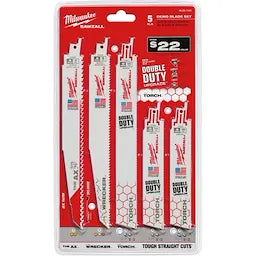 The Milwaukee 5 piece Demolition Sawzall blade set features an assortment of our most popular demolition blades for a broad range of professional applications. Milwaukee demolition blades are thicker for maximum durability and taller for straighter cuts. The set features The Ax for cutting nail embedded wood, The Wrecker for multi-material demolition cutting, and The Torch for metal cutting.