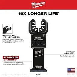 Our OPEN-LOK™ 1-3/8" TITANIUM CHARGED™ Bi-Metal Oscillating Multi-Tool Blades are made from premium high-speed steel. These bi-metal blades are ideal for cuts in wood, nails, PVC, and drywall. TITANIUM CHARGED™ Bi-Metal blades have an optimized titanium blend for maximum wear-resistance and up to 15x longer life vs. high carbon steel (HCS) blades. These blades feature a reinforced Universal Fit OPEN-LOK™ anchor for better strength & control and allow for quick blade changes across 100+ multi-tools. Not compatible with Starlock tools. MILWAUKEE® oscillating multi-tool blades are designed and made in the USA with global materials.