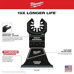 Our OPEN-LOK™ 2-1/2" TITANIUM CHARGED™ Bi-Metal Multi-Material Oscillating Multi-Tool Blades are made from premium high-speed steel. These bi-metal blades are ideal for cuts in wood, nails, PVC, and drywall. TITANIUM CHARGED™ Bi-Metal blades have an optimized titanium blend for maximum wear-resistance and up to 15x longer life vs. high carbon steel (HCS) blades. These blades feature a reinforced Universal Fit OPEN-LOK™ anchor for better strength & control and allow for quick blade changes across 100+ multi-tools. Not compatible with Starlock tools. MILWAUKEE® oscillating multi-tool blades are designed and made in the USA with global materials.