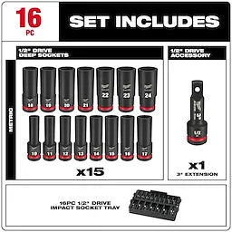 - Kit includes 15 Deep Metric Sockets and 1 Impact Socket Accessory. The following sizes are included: 10mm, 11mm, 12mm, 13mm, 14mm, 15mm, 16mm, 17mm, 18mm, 19mm, 20mm, 21mm, 22mm, 23mm, 24mm, 3" Extension