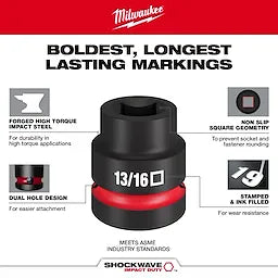 Our SHOCKWAVE Impact Duty™ 1" Drive 13/16" 4 Point Socket features the boldest, longest-lasting markings. The stamped and ink-filled size markings enable you to select the right socket every time throughout the life of the socket. The 4-point standard sockets are engineered with high-strength forged steel for optimized performance in high stress applications, and a non-slip square geometry prevents fastener rounding. The dual-hole design and ring groove allow for easy socket attachment and removal. Our Lifetime Guarantee backs all MILWAUKEE® SHOCKWAVE Impact Duty™ Sockets and meets ASME industry standards.