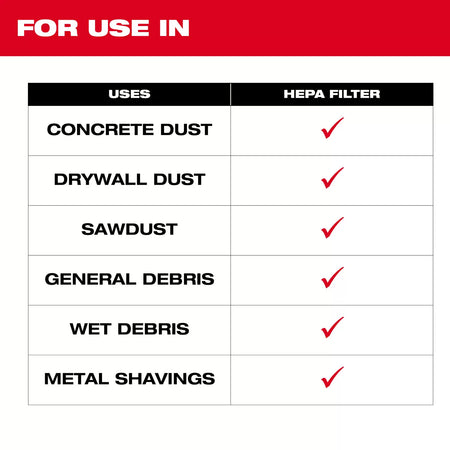 Our HEPA Filter (2PK) is compatible with the M18 FUEL™ 9 Gallon Dual Battery Dust Extractor w/ PACKOUT™ Compatibility & VACLINK™ (0888-20/22HD). The HEPA Filters capture 99.97% of all particles greater than 0.3 microns for fine dust collection, ensuring dust and microparticle collection of debris such as concrete dust, sawdust, and drywall dust. The MILWAUKEE® HEPA Filter (2PK) is dry cleanable and reusable after cleaning.