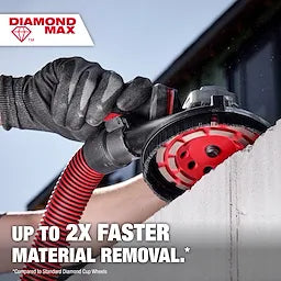 Our DIAMOND MAX™ Double Row Diamond Cup Wheels deliver up to 2X faster material removal. Milwaukee's unique diamond formula provides up to 5X life on concrete. The double-row cup wheels have increased surface contact for increased grinding control and a smooth surface finish. These diamond cup wheels are designed with a vented core for efficient dust extraction. Ideal for use in grinding concrete, leveling, and adhesive removal. Equipped with 5/8"-11 threaded arbor for use in angle grinders. For use wet and dry.