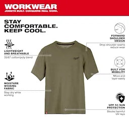 Our Short Sleeve Hybrid Work Tee is a lightweight and breathable solution that allows you to STAY COMFORTABLE and KEEP COOL. This work t-shirt is specifically created for mobility and durability with its drop shoulder design to reduce wear on the seams. The MILWAUKEE® Hybrid Work Tee Shirts are built to protect against the elements, offering UPF 50 protection for those warm days on the jobsite and moisture-wicking fabric so you can stay dry while working. Choose from a variety of colors, including black, blue, gray, and green, available in sizes small to 3XL.