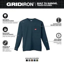 Part of the MILWAUKEE® GRIDIRON™ Collection, our Long Sleeve Pocket Tee is BUILT TO SURVIVE. Our Pocket Tees are built from durable, reliable fabric for ALL DAY PROTECTION to OUTLAST THE JOB. This long sleeve t-shirt is engineered for broken-in comfort on day one and continues to get better over time. Designed with a relaxed fit for plenty of room to move. Our moisture wicking and anti-odor technologies make the Heavy Duty Pocket T-Shirt a go-to any time of year.