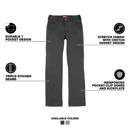 Our MILWAUKEE® Women’s Work Pants are built from a tear-and-abrasion-resistant fabric that provides broken-in comfort right off the shelf. With a high rise straight fit and integrated stretch, this work pant allows you to work hard without stiffness. The MILWAUKEE® Women’s Work Pants are engineered to be your everyday go-to with features designed for tradeswomen: triple-stitched seams, dedicated tool clip-on zones, seven durable and deep pockets, wide belt loops, and a reinforced kick plate. Milwaukee® Workwear products are developed in collaboration with feedback from users across the trades through continuous jobsite research.