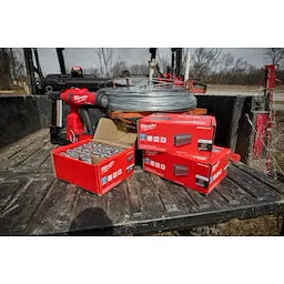 Our MILWAUKEE® 9 Gauge Galvanized Staples are intended for use in attaching wire fencing to wood fence posts, as well as securing copper grounding wire to utility poles. These staples are zinc-aluminum coated hot dipped galvanized to ensure corrosion resistance. Our staples have barbed and coated divergent staple legs for increased holding power in materials. The diamond crown design allows for use with larger wire sizes and small plastic moldings. Available in 3 lengths: 1 1/2", 1 3/4", 2"