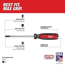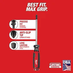 Our Milwaukee® Cushion Grip Screwdrivers (USA) are manufactured to give the professional the best-fitting screwdriver with max grip. Our screwdriver tips are custom machined to deliver a precise fit and reduce stripping during demanding fastening applications. For added confidence, the tips are laser etched to increase the gripping surface. Manufactured with high-strength boron-infused steel for increased hardness, our screwdrivers stand up to the demands of the site with ultimate durability and life. Providing increased versatility, select screwdrivers include a wrench-ready bolster for added torque and a knurled shank for precision control. Quick identification markings on the handle make it easy to identify screwdriver tip size and type, including Phillips, cabinet, ECX, slotted, and square. The demolition screwdrivers also include a hammer-ready strike cap. Our screwdrivers range in shank sizes from 3-inch to 10-inch. Our Milwaukee Cushion Grip Screwdrivers (USA) are made in the USA with best-in-class manufacturing technology and USA-sourced materials all backed by a complete Lifetime Guarantee.