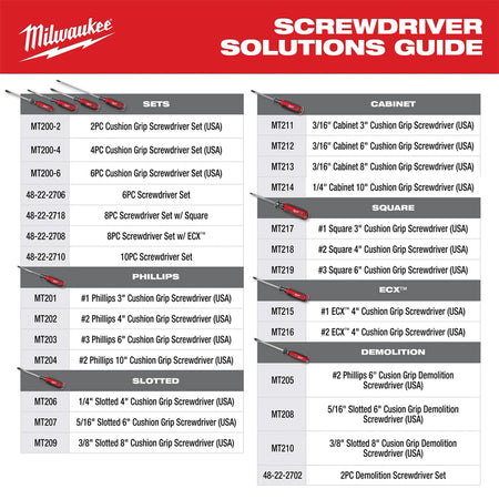 Our MILWAUKEE® Cushion Grip Screwdrivers (USA) are manufactured to give the professional the best-fitting screwdriver with maximum grip. Our screwdriver tips are custom-machined to deliver a precise fit and reduce stripping during demanding fastening applications. For added confidence, the tips are laser etched to increase the gripping surface. Manufactured with high-strength boron-infused steel for increased hardness, our screwdrivers stand up to the demands of the site with ultimate durability and life. Providing increased versatility, select screwdrivers include a wrench-ready bolster for added torque and a knurled shank for precision control. Quick identification markings on the handle make it easy to identify screwdriver tip size and type, including Phillips, cabinet, ECX, slotted, and square. The demolition screwdrivers also include a hammer-ready strike cap. Our screwdrivers range in shank sizes from 3-inch to 10-inch. Our Milwaukee Cushion Grip Screwdrivers (USA) are made in the USA with best-in-class manufacturing technology and USA-sourced materials, all backed by a complete Lifetime Guarantee.