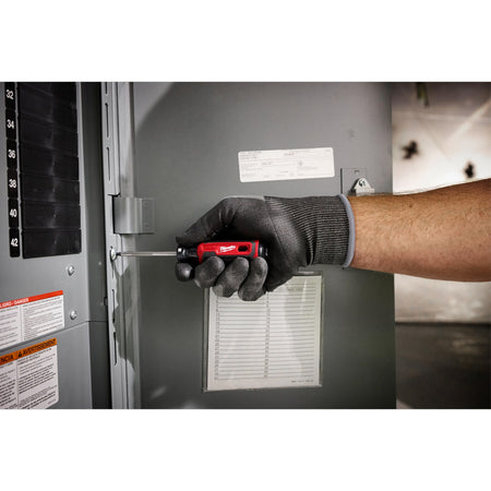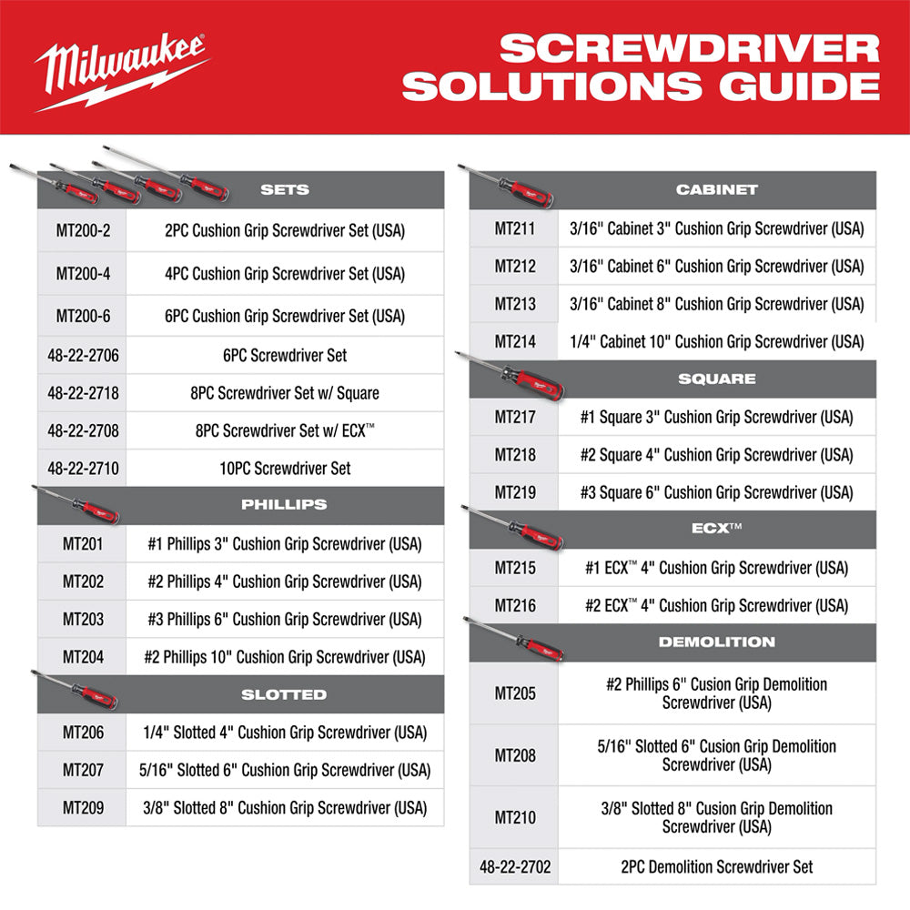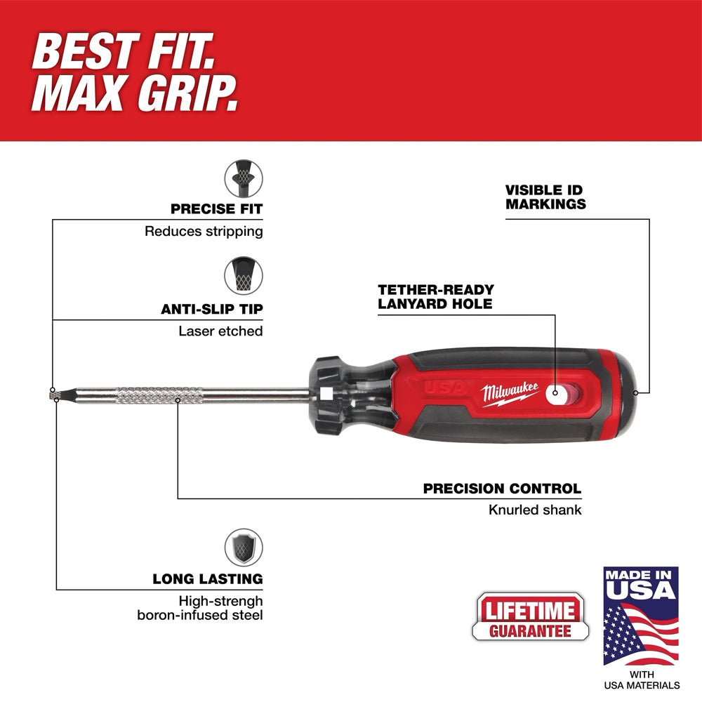 Our Milwaukee® Cushion Grip Screwdrivers (USA) are manufactured to give the professional the best-fitting screwdriver with maximum grip. Our screwdriver tips are custom-machined to deliver a precise fit and reduce stripping during demanding fastening applications. For added confidence, the tips are laser etched to increase the gripping surface. Manufactured with high-strength boron-infused steel for increased hardness, our screwdrivers stand up to the demands of the site with ultimate durability and life. Providing increased versatility, select screwdrivers include a wrench-ready bolster for added torque and a knurled shank for precision control. Quick identification markings on the handle make it easy to identify screwdriver tip size and type, including Phillips, cabinet, ECX, slotted, and square. The demolition screwdrivers also include a hammer-ready strike cap. Our screwdrivers range in shank sizes from 3-inch to 10-inch. Our Milwaukee Cushion Grip Screwdrivers (USA) are made in the USA with best-in-class manufacturing technology and USA-sourced materials, all backed by a complete Lifetime Guarantee.