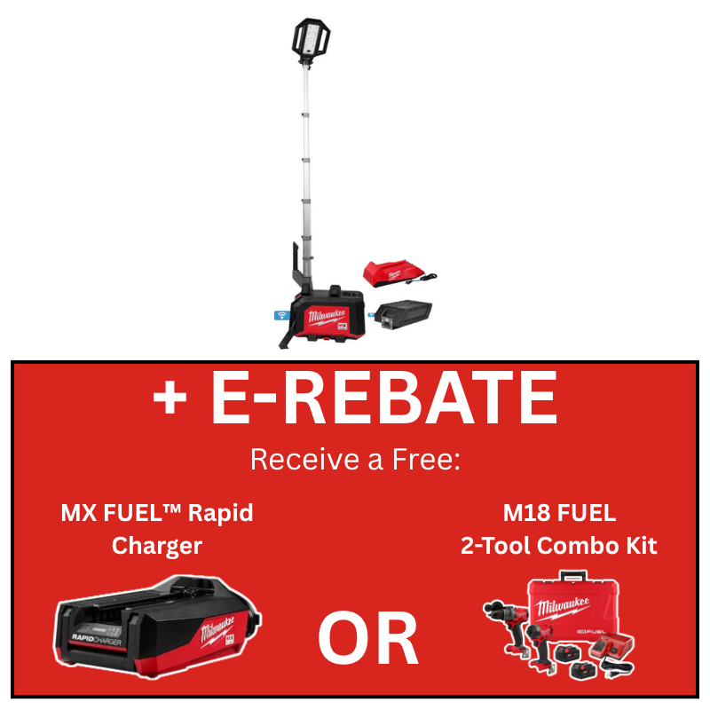Our MX FUEL™ ROCKET™ Dual Power Compact Tower Light is our most power-dense tower light, delivering exceptional site lighting capabilities in a compact size. The unit delivers up to 15,000 lumens of task and area lighting. It covers over 2,300 sq ft and provides over 5X the usable lighting of an M18 ROCKET™ Dual Power Tower Light. The Compact Tower Light provides maximum portability, requiring 75% less space to store and transport than the MX FUEL™ ROCKET™ Tower Light/Charger. The impact-resistant molded base connects with the MILWAUKEE® PACKOUT™ Modular Storage System via integrated locking cleats for unmatched portability on the jobsite. It features an oversized carry handle and is under 50lbs with the kitted MX FUEL™ REDLITHIUM™ XC406 Battery. When powered with the kitted battery, the unit runs up to 3 hours on high or up to 10 hours on low, for powerful lighting without cords or generators. The Dual Power feature allows users to plug in for all-day use. The 7’ folding mast can be quickly deployed in seconds. The Compact Tower Light has 2 deployable outriggers for increased stability and use on uneven terrains. The unit is not only portable and fast to set-up but also durable, featuring an IP56 Rating for water and dust protection, making it capable for use both indoors and out. The included ONE-KEY™ Bluetooth Card gives you the ability to remove, replace, or upgrade connectivity over the life of your machine. Fully compatible with our MX FUEL™ Equipment System.