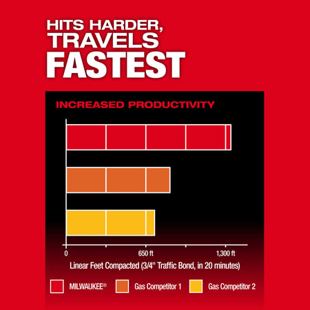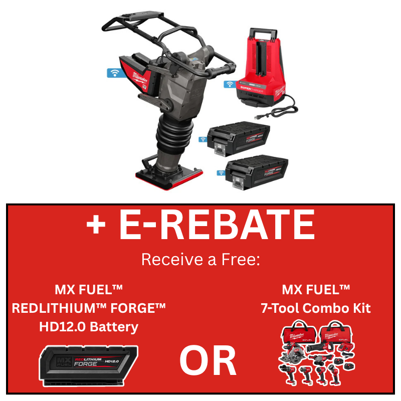 Our MX FUEL™ 70kg Rammer is the most productive and easiest to use. The POWERSTATE™ Brushless Motor delivers the power to hit harder and travel faster for maximum productivity without sacrificing compaction performance. The rammer provides no gas headaches with push button start and no engine to maintain, reducing downtime and allowing you to get jobs done faster. Zero emissions mean a safer workspace indoors and in trenches, while superior stability combined with the tools Tip Detect feature provides user’s confidence to operate safely in any environment. It also offers greater control, with a centralized User Interface, allowing you simple start / stop and fast / slow, for easier maneuverability in trenches and confined spaces. The MX FUEL™ 70kg Rammer is kitted with (2) MX FUEL™ REDLITHIUM™ FORGE™ HD12.0 batteries & a Super Charger. In just 65 minutes, you can charge an MX FUEL™ REDLITHIUM™ FORGE™ HD12.0 to 100%. Both the MX FUEL™ REDLITHIUM™ FORGE™ HD12.0 Battery & MX FUEL™ Super Charger are COOL-CYCLE™ Capable. COOL-CYCLE™ Active Cooling System, provides high-speed cooling for less downtime. The active cooling feature works with MX FUEL™ batteries that have COOL-CYCLE™ capability. The MX FUEL™ REDLITHIUM™ FORGE™ HD12.0 Battery gives you 25 minutes of continuous runtime or over a quarter mile of compaction. REDLINK PLUS™ Intelligence ensures optimal performance and provides overload protection to protect your machine and battery during the toughest applications. You can track, manage, and secure your equipment from your mobile device or computer using the industry’s largest Bluetooth® community tracking network. If your rammer is ever lost or stolen, you can prevent tampering with remote lockout capability. The MILWAUKEE® MX FUEL™ 70kg Rammer is fully compatible with ONE-KEY™ and our MX FUEL™ Equipment System.