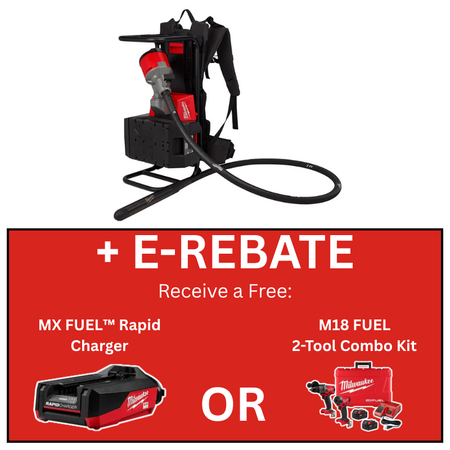 The MX FUEL Backpack Concrete Vibrator provides consistent starts and the most reliable pours with the power to push up to 2-1/2” heads, no gas headaches, consolidating up to 70 yds³ per charge with a 1-1/2” head and 7’ shaft. The POWERSTATE Brushless Motor delivers the power to push up to 2-1/2” head at over 11,000 VPM for optimal consolidation, even in the stiffest concrete. The MX FUEL REDLITHIUM battery pack provides instant power with no gas headaches and requires no regular maintenance, produces less noise, and zero emissions for a safer workspace, indoors or outdoors. The push-button start delivers instant power, eliminating the repetitive motions of a pull start and reducing downtime, allowing you to get jobs done faster without sacrificing the power and runtime you expect. The battery-powered backpack vibrator is compatible with all MX FUEL REDLITHIUM batteries, giving you the hardest working and most reliable power for equipment. The modular design makes it easy to remove the backpack harness for walls and columns. The MX FUEL Backpack Concrete Vibrator can accept whips up to 21 ft. long without sacrificing power. The wireless remote gives you the ability to turn the machine on from up to 30 ft. away for more freedom when using long whips. REDLINK PLUS Intelligence ensures optimal performance and provides overload protection to protect your machine and battery during the toughest applications. The MILWAUKEE MX FUEL Backpack Concrete Vibrator is ONE-KEY Compatible. You can track, manage and secure your equipment from your mobile device or computer using the industry’s largest Bluetooth community tracking network. If your concrete vibrator is ever lost or stolen, you can prevent tampering with remote lockout capability.