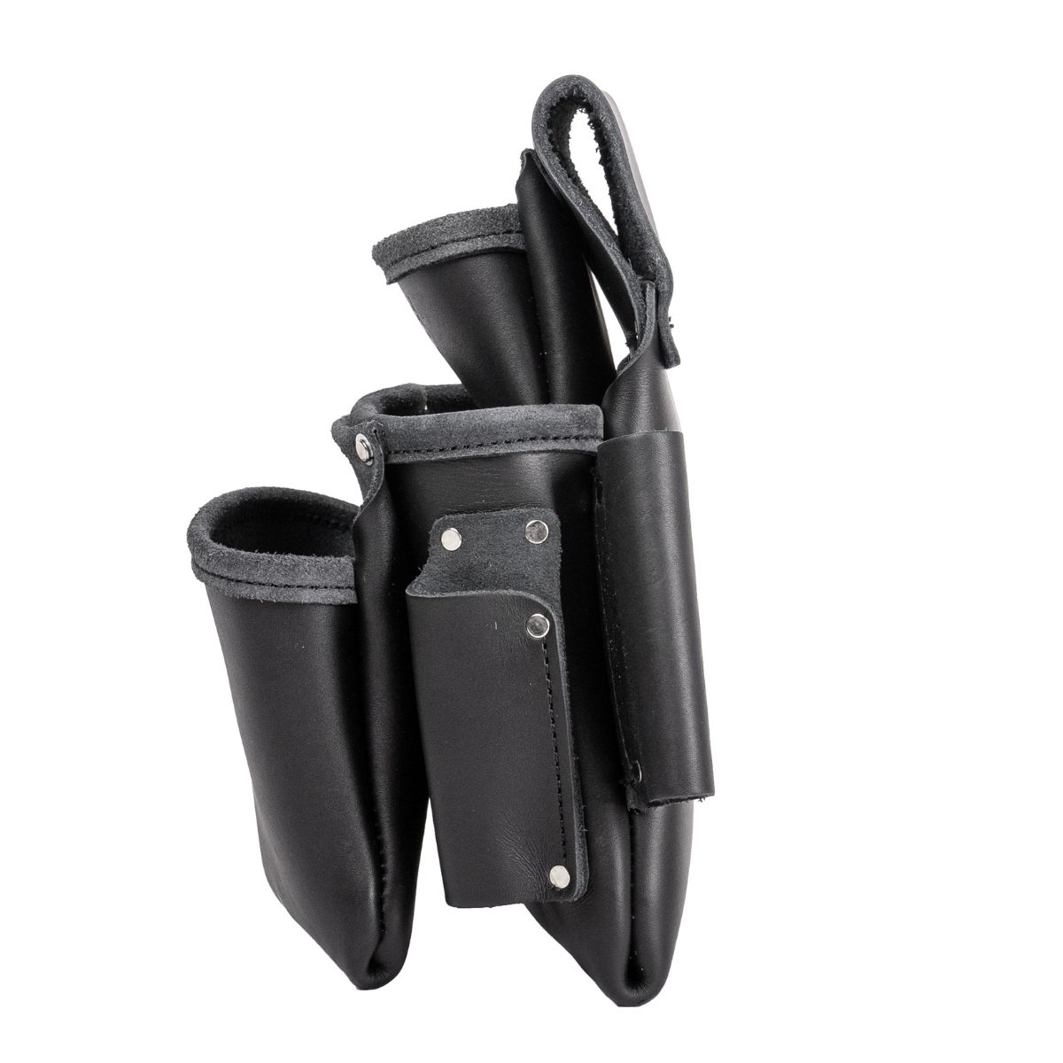 The most popular leather fastener bag. Highly recommended for framing and general carpentry applications. Holders for 1” blade square, angle square, cat’s paw loop, driver bits, etc.